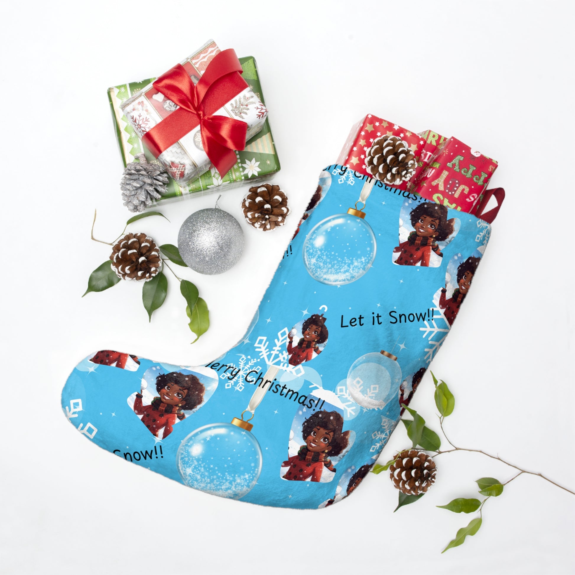 Let it snow Christmas stockings that are spacious, soft, and plush. Perfect for filling with presents and hanging by the fireplace during the holiday season. Ideal for anyone looking to add a festive touch to their Christmas decor.